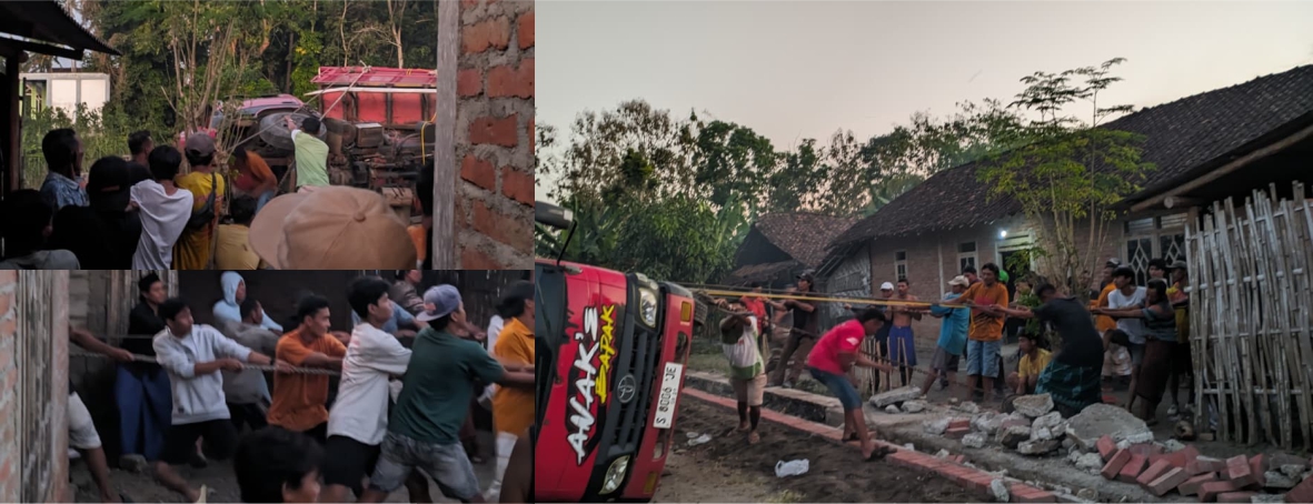 Material tersebut rencananya akan digunakan untuk perbaikan jalan desa, bagian dari upaya meningkatkan sarana transportasi dan akses masyarakat. Karena kondisi jalan yang sebagian rusak dan berlubang, truk mengalami kesulitan untuk bergerak menuju lokasi penurunan material. Melihat situasi tersebut, para mahasiswa KKN bersama warga secara spontan bergabung menarik truk secara manual. Dengan menggunakan tali pengikat dan kekuatan bersama, upaya penarikan berhasil menyelamatkan truk dari terguling.